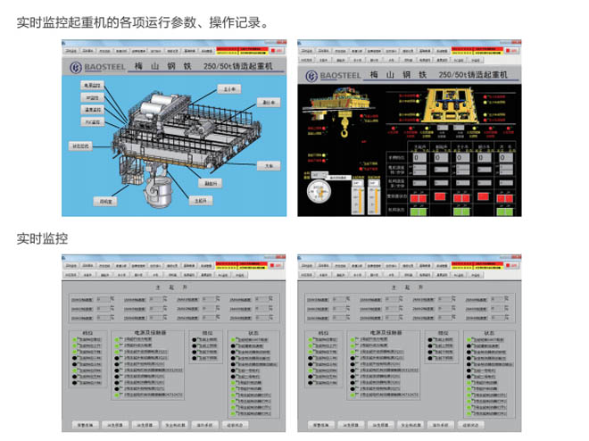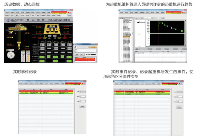 •-1、起重機狀態(tài)實時監(jiān)測:對事故易發(fā)設備和重點關鍵設備的運行情況進行實時監(jiān)測,同時 對采集的數(shù)據(jù)進行分析整理,并把現(xiàn)場的實際數(shù)據(jù)與相關的設備運行指標進行對比,超過偏 差限制時產(chǎn)生報警信息并存儲報警記錄。共享相關數(shù)據(jù),為及時發(fā)現(xiàn)和消除設備故障隱患提 供必要的數(shù)據(jù)支持。